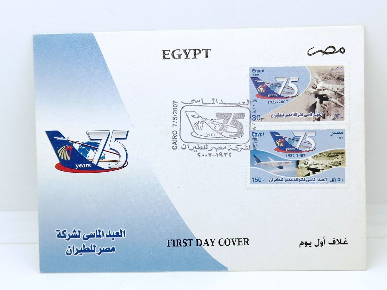 المجموعة بها ظرف واحد يحتوي علي طابعين وفئتهما : ثلاثون قرش , و مائة وخمسون قرشا ,اليوبيل الماسي لشركة مصر للطيران