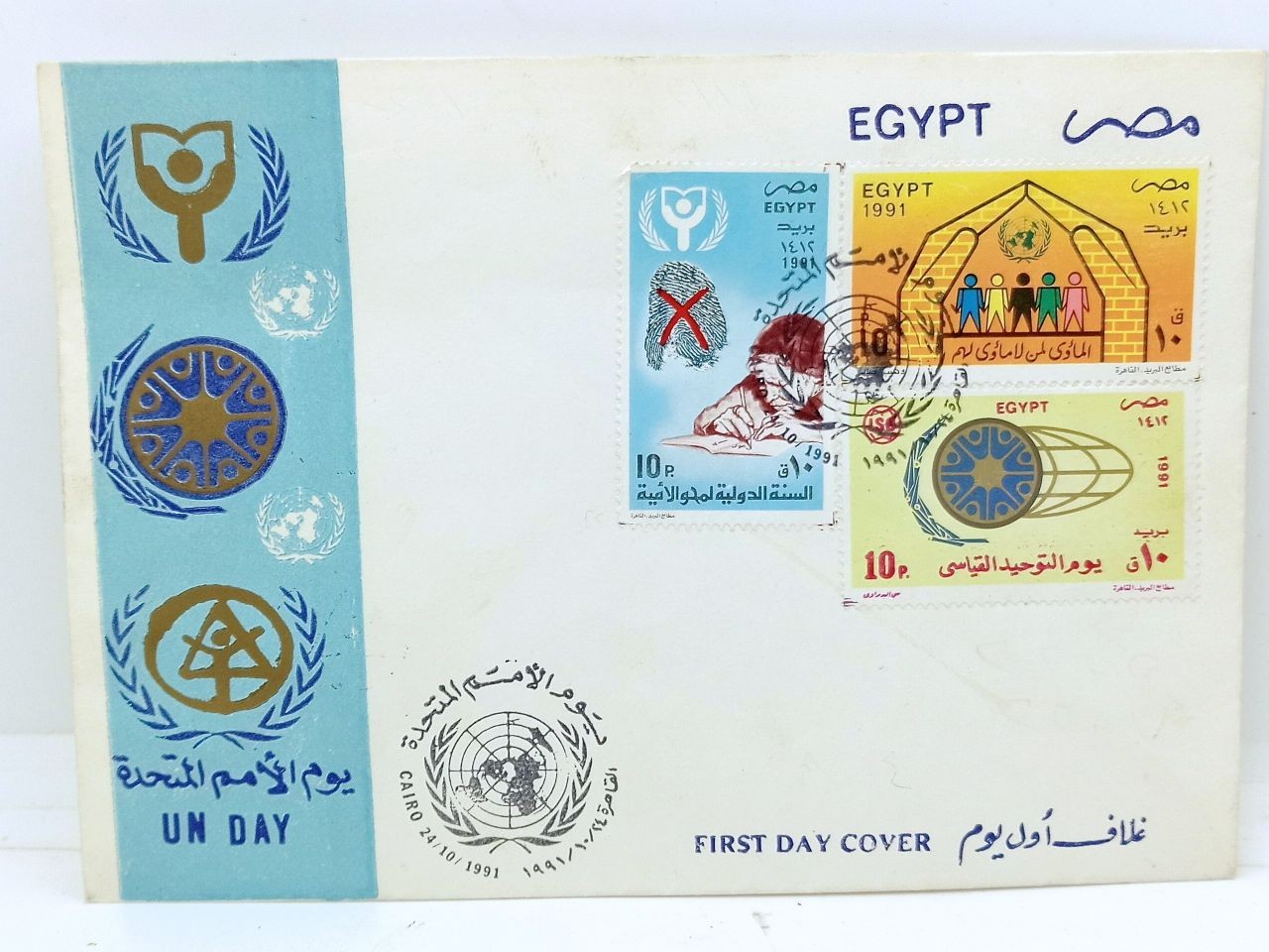 المجموعة بها ظرف واحد يحتوي علي طابعين وفئتهما : ثلاثون قرشا , يوم الأمم المتحدة