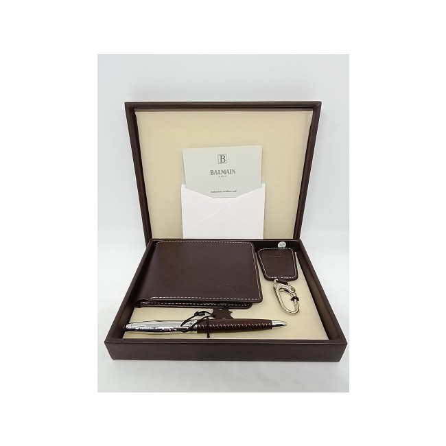 طقم كلاسيكي مميز للرجال يحتوي الطقم علي ( قلم - محفظة - ميدالية ) غاية في الرقي خامة المحفظة : من الجلد الطبيعي باللون البنى خامة القلم : ستانليس ستيل مطلي بالجلد الطبيعى البنى خامة الميدالية : من الجلد الطبيعي باللون البنى ماحق مع الطقم شهادة الضمان