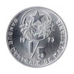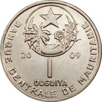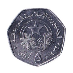 The ouguiya (sign: UM;Arabic: أوقية; currency code: MRU), also spelled "ougiya", is the currency of Mauritania. Each ouguiya constitutes five khoums (singular and plural in English, Arabic: خمس, meaning "one fifth"). As such it is one of two circulating currencies, along with the Malagasy ariary, whose division units are not based on a power of ten.