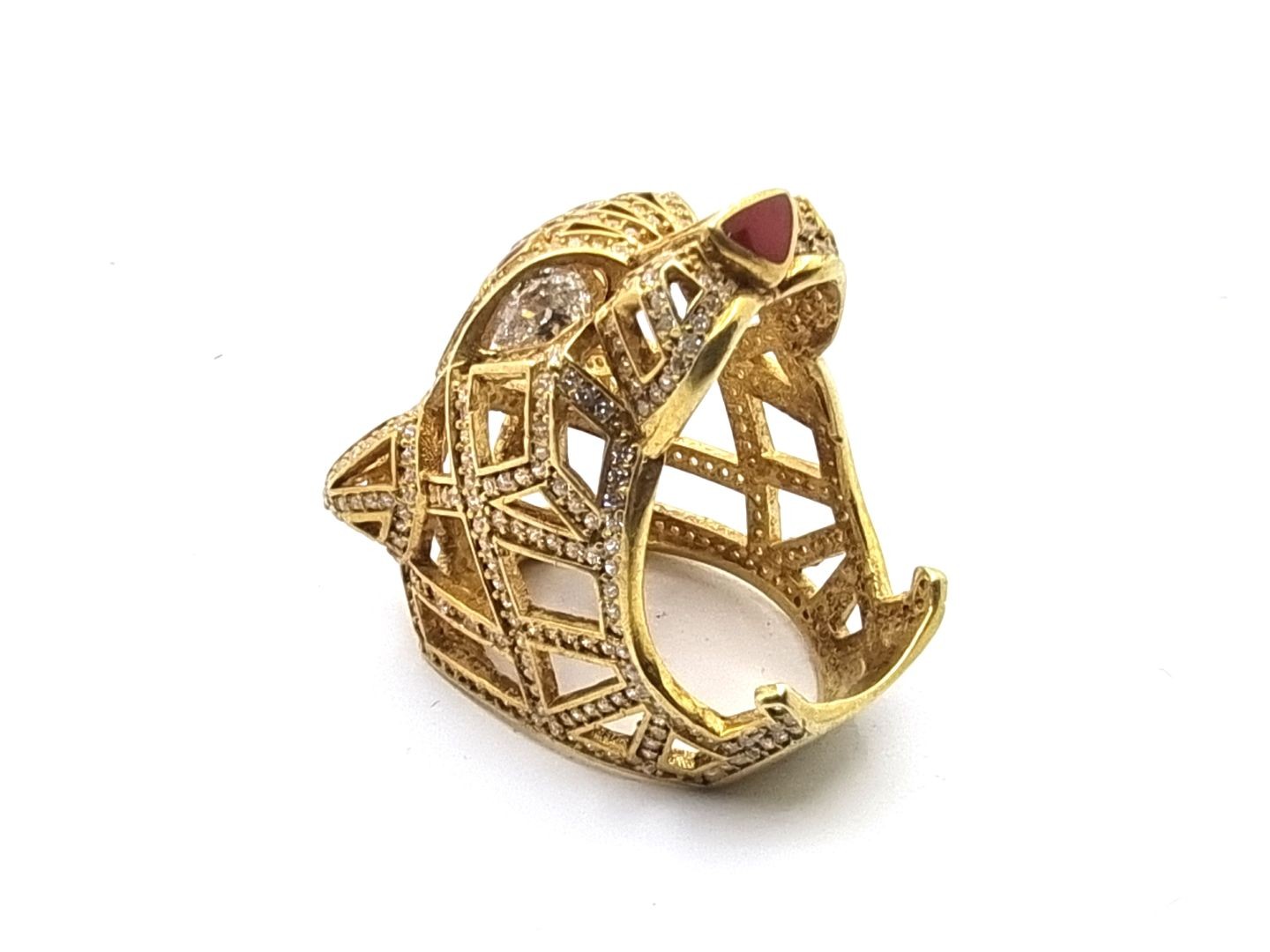 Silver ring plated with gold in the shape of a lion With ruby ​​stones