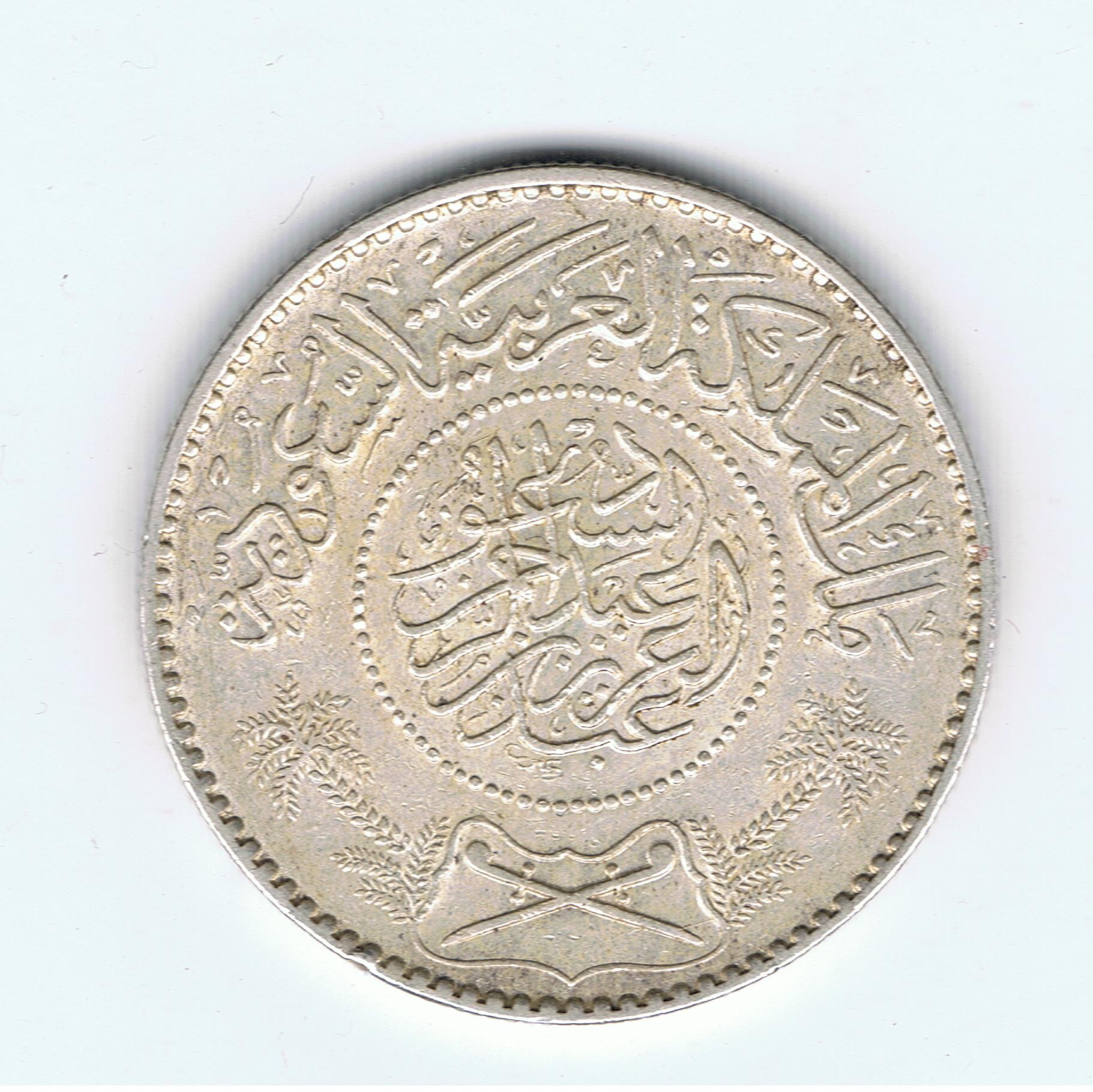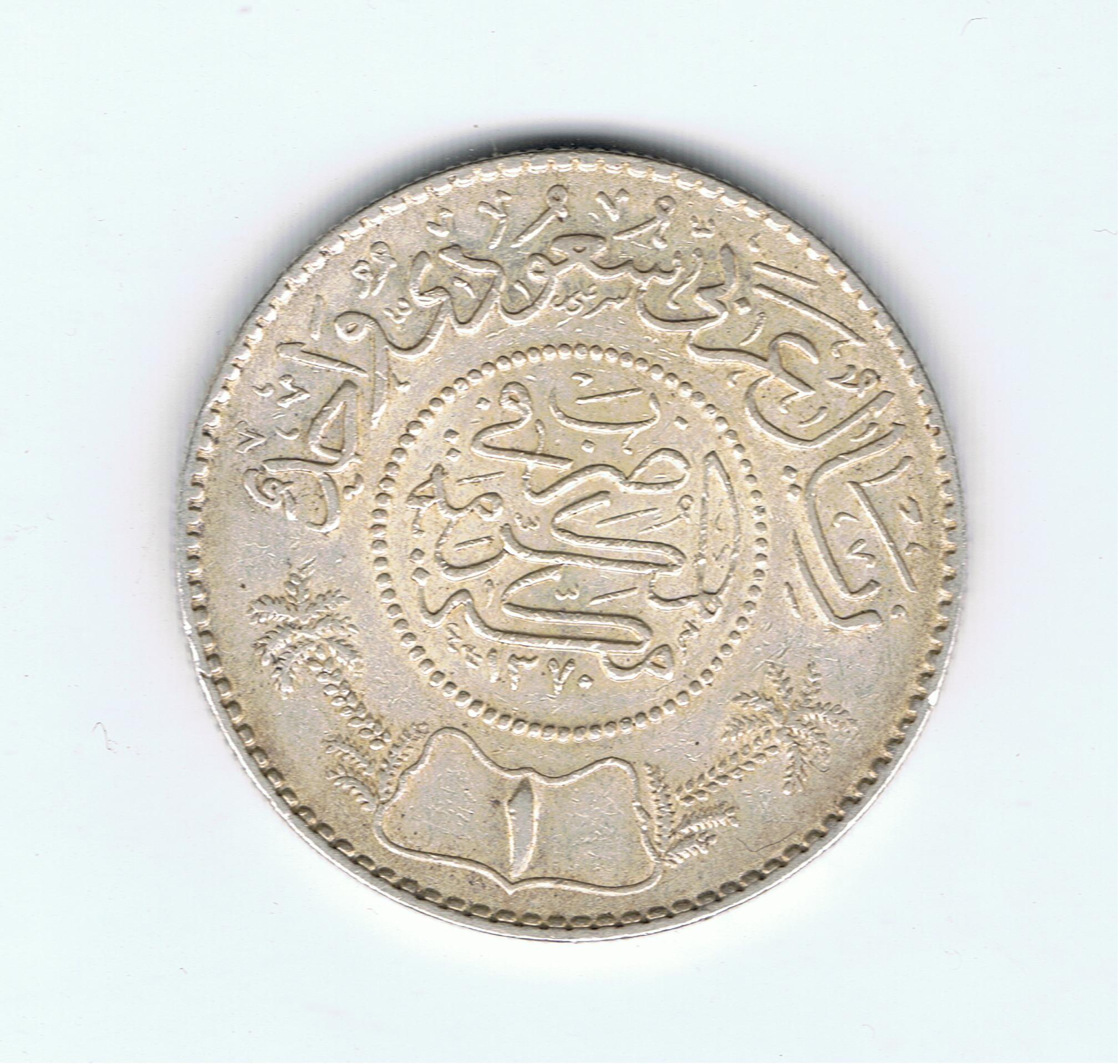 Inscription within beaded circle, legend above, value below within design flanked by palm trees Lettering: ريال عربي سعودي واحد ضرب في المكرمة مكة ١٣٧٠ ١ Translation: One Saudi Arabian Rial Struck in the holy City of Mecca 1370 1