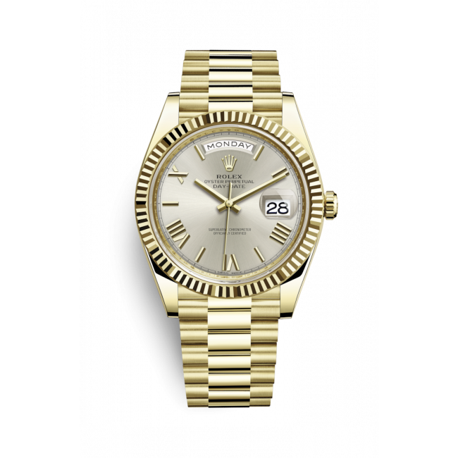 MODEL CASE Oyster, 40 mm, yellow gold OYSTER ARCHITECTURE Monobloc middle case, screw-down case back and winding crown DIAMETER 40 mm MATERIAL 18 ct yellow gold BEZEL Fluted WINDING CROWN Screw-down, Twinlock double waterproofness system CRYSTAL Scratch-resistant sapphire, Cyclops lens over the date WATER-RESISTANCE Waterproof to 100 metres / 330 feet