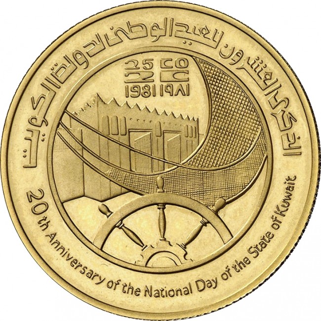 Dates, building, fishing net and captain's wheel within circle Lettering: الذكرى العشرون للعيد الوطنى لدولة الكويت 25 CO 2 C 1981 ١٩۸١ 20th Anniversary of the National Day of the State of Kuwait