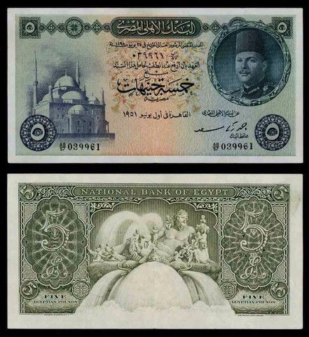 On the right side a picture of king Farouk I and on the left side the mosque of Mohamed Ali
