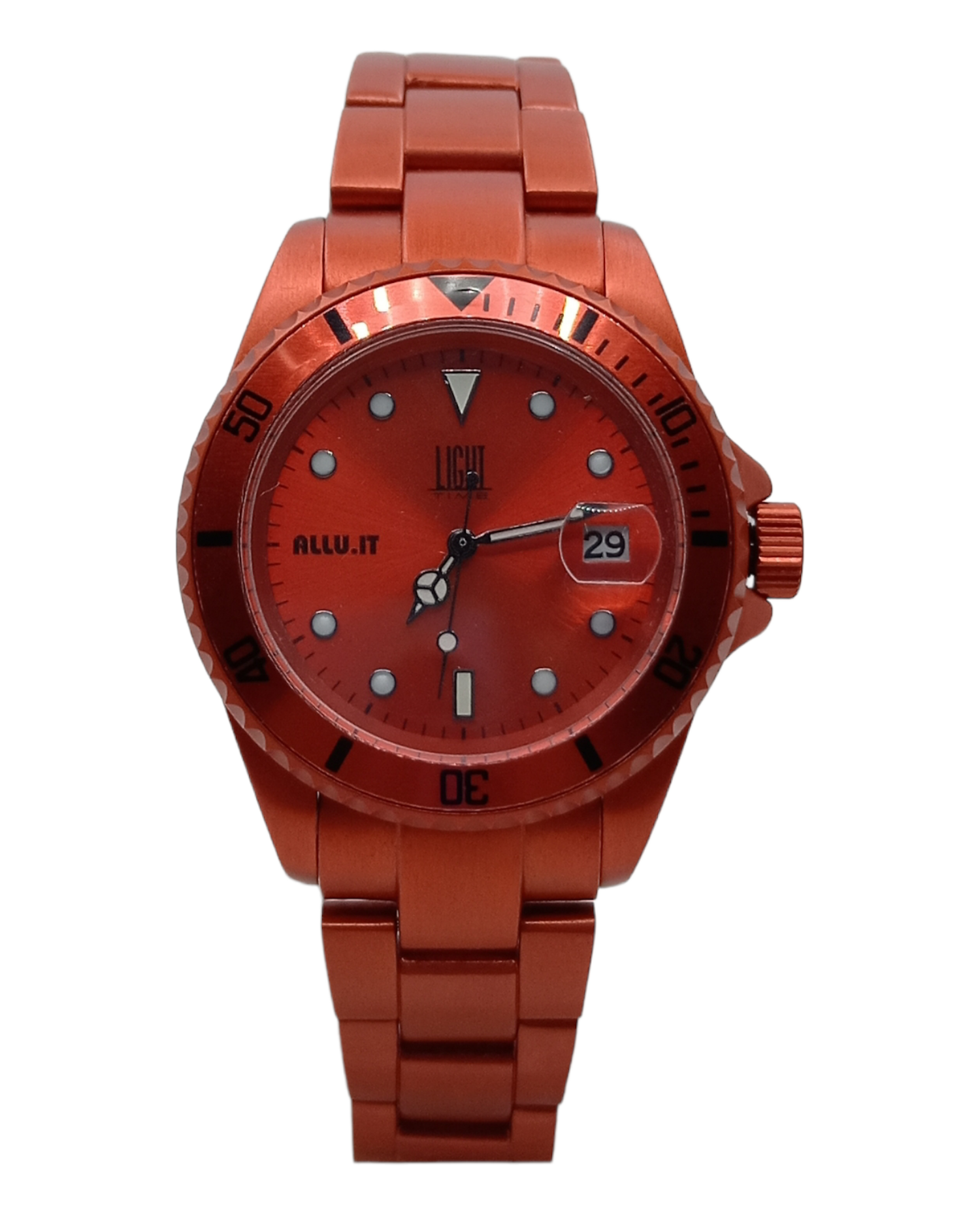 The watch is made of stainless steel and acrylic